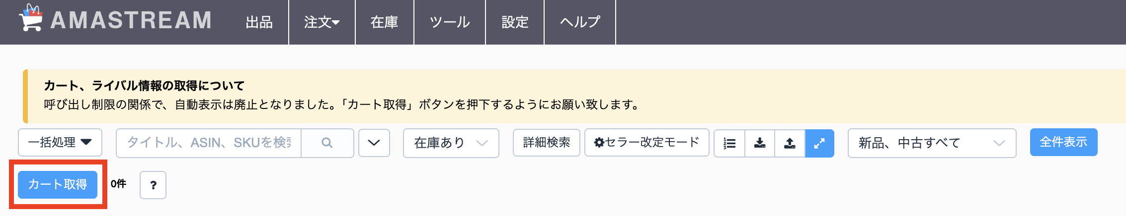 「カート取得」ボタン(100件ごとの取得)、もしくはカート欄の「取得」ボタン(1件ごとの取得)をクリックすることで、カート価格を表示 ・ ※「合わせる」ボタンから、カート金額に合わせたり、価格の微調整が可能