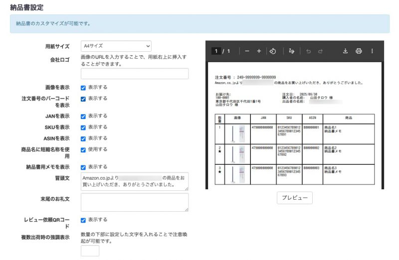 ・納品書メモの表示/非表示(内容はアマストリームの納品書メモと同期します)