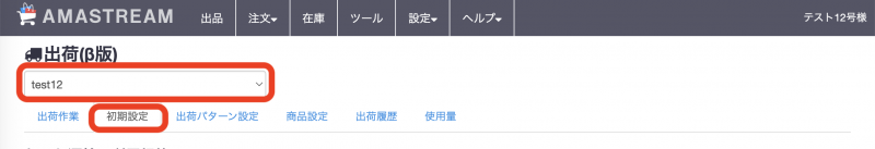 ①出荷作業を行うセラーを選択し、初期設定タブを開きます。
