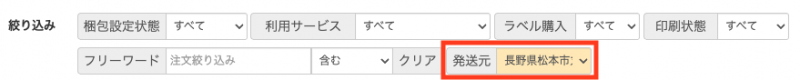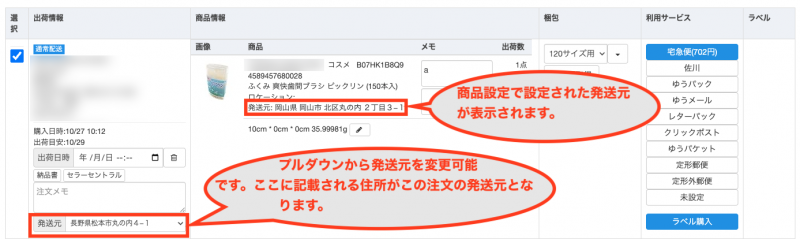 未出荷注文の取り込みを行うと、下記画像のように反映されます。出荷作業画面上での発送元変更も可能です。
