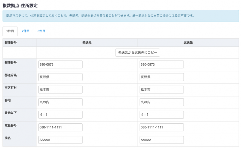 ②「複数拠点-住所設定」の項目までスクロールし、1件目、2件目、3件目のタブをクリックして住所を入力します。